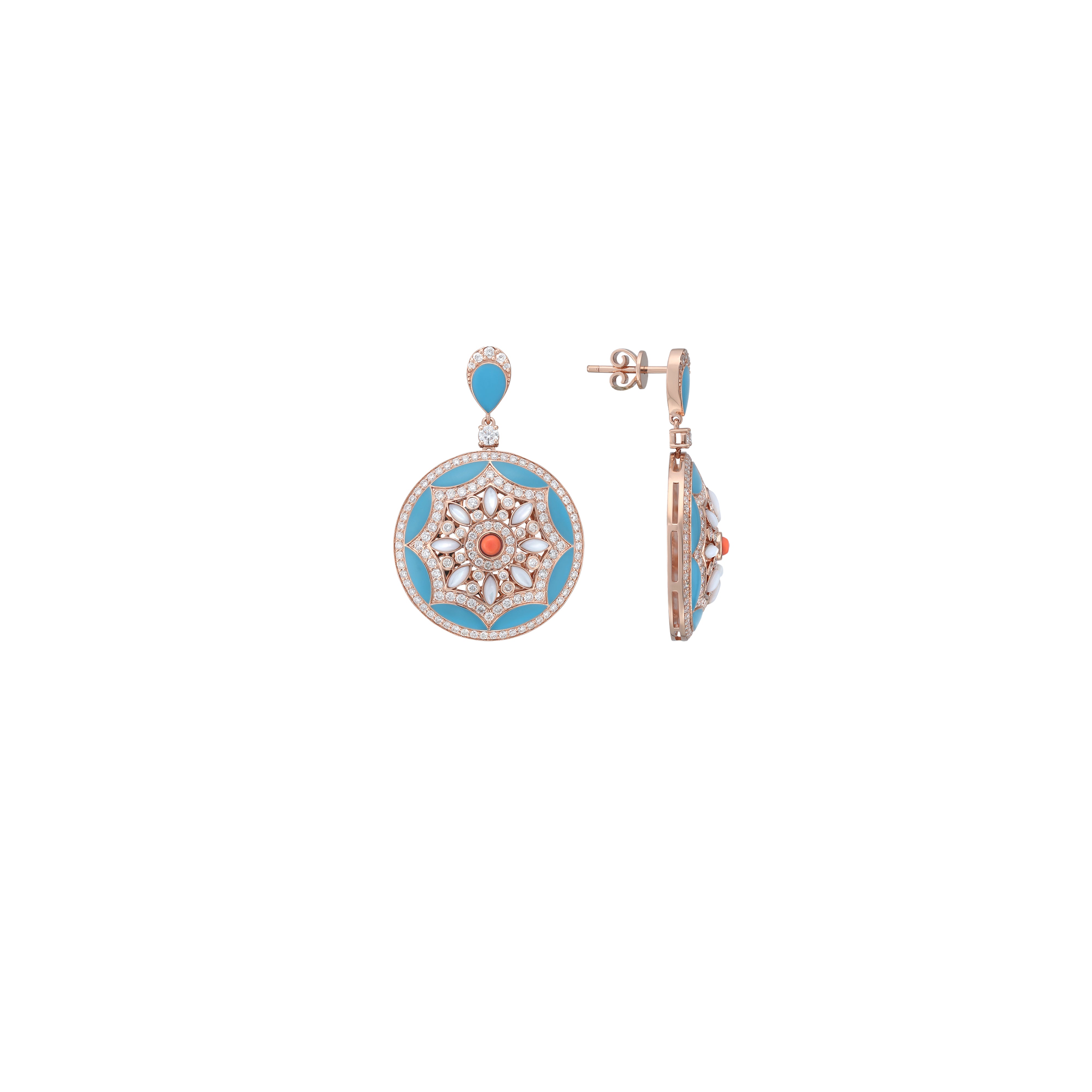 Regular price Dhs. 17,800.00Sale price Dhs. 17,800.00 Regular priceUnit price / perA luxurious earring crafted in Rose Gold Gold, weighing 16.59g. Adorned with 2.07 carats of diamonds, clarity SI, color GH. Features a unique CORAL & MOP...