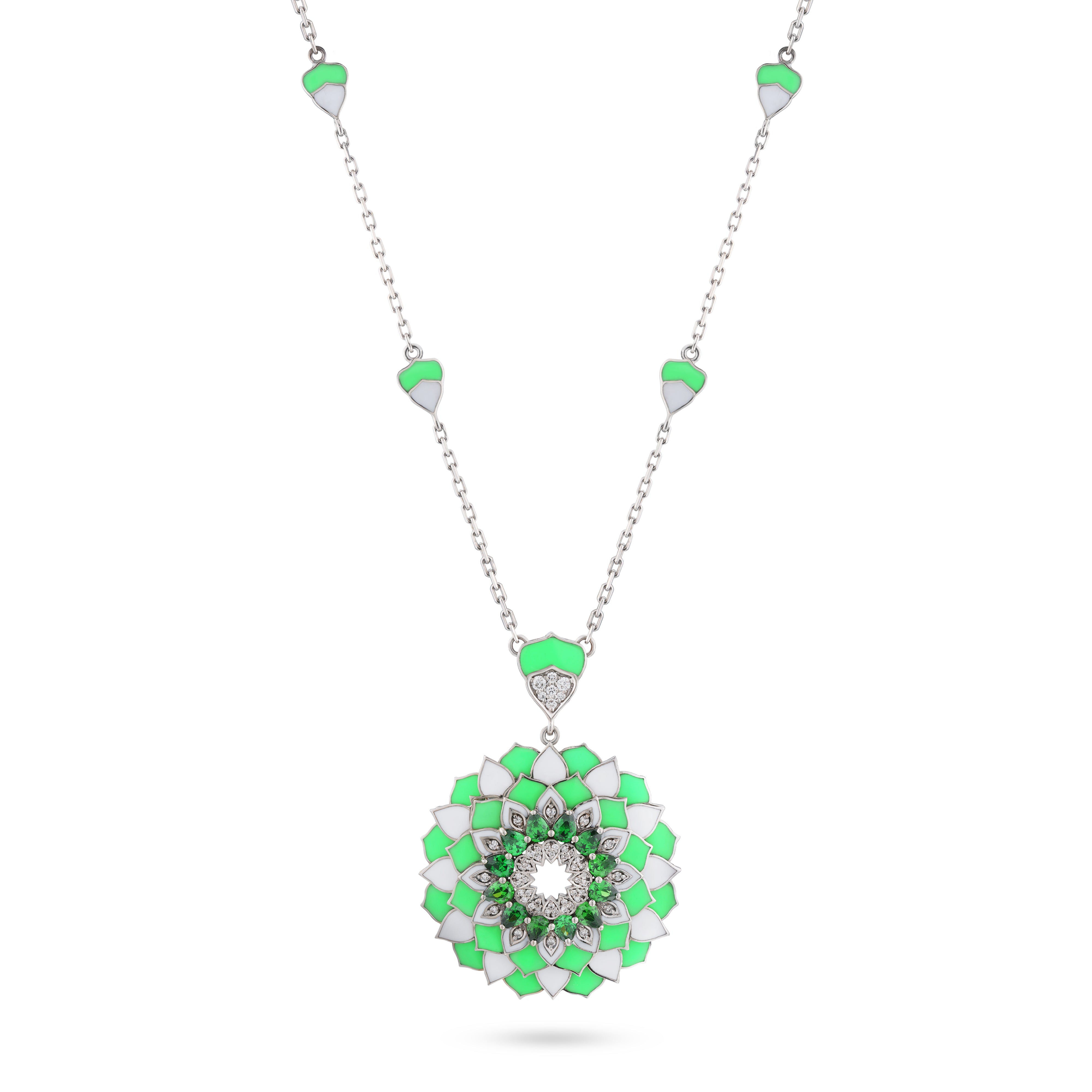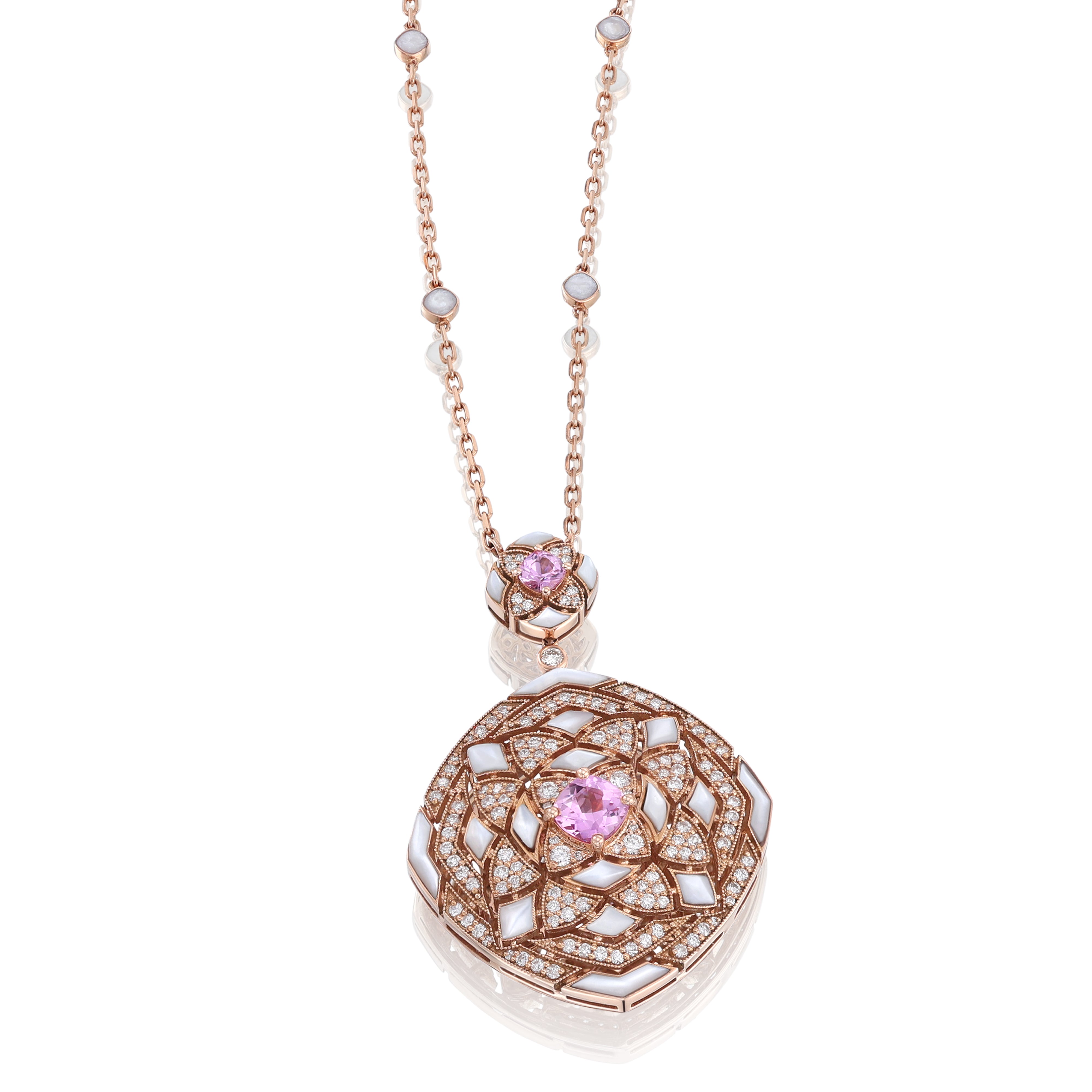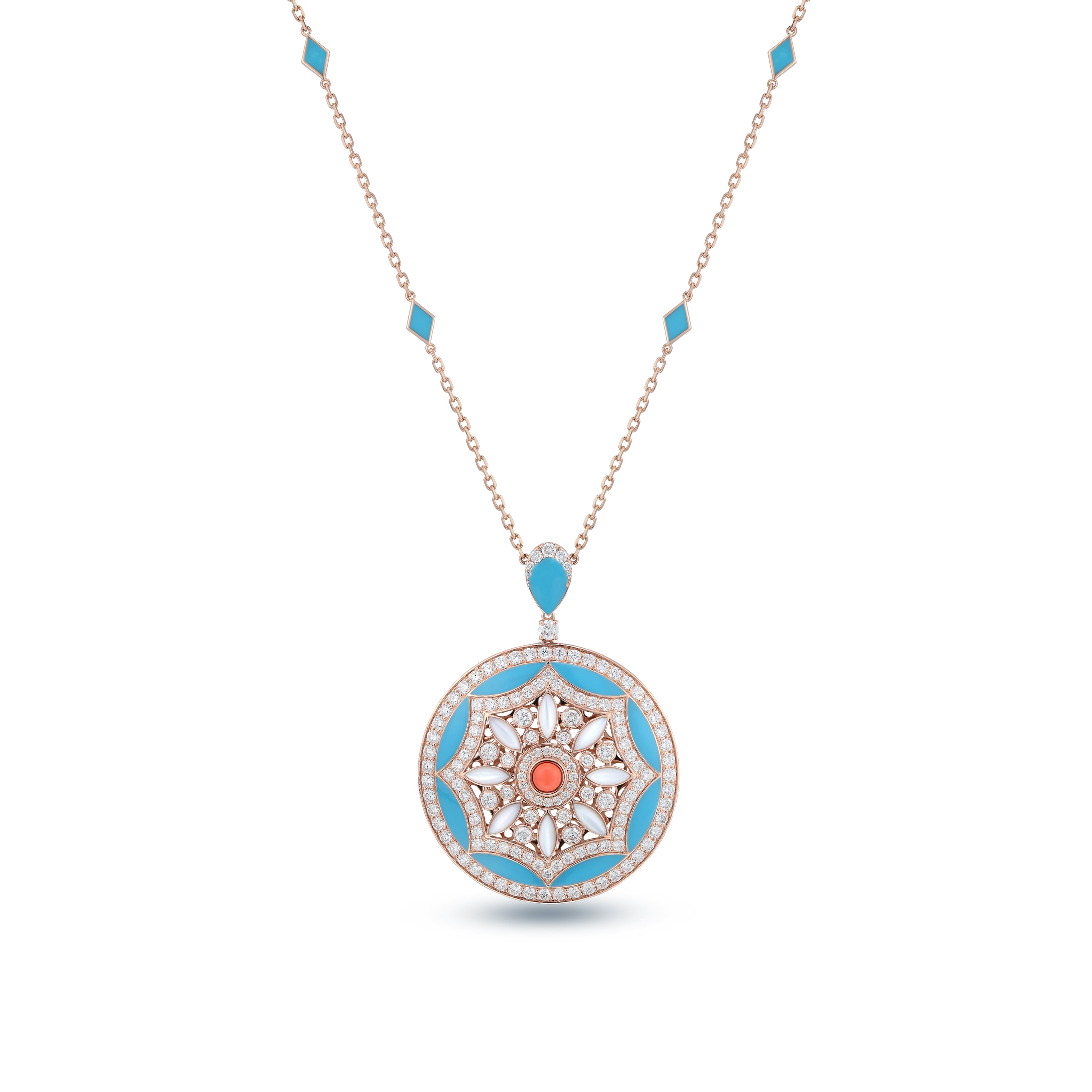 Regular price Dhs. 29,950.00Sale price Dhs. 29,950.00 Regular priceUnit price / perA luxurious pendant crafted in Rose Gold Gold, weighing 25.11g. Adorned with 4.38 carats of diamonds, clarity SI, color GH. Features a unique CORAL & MOP...